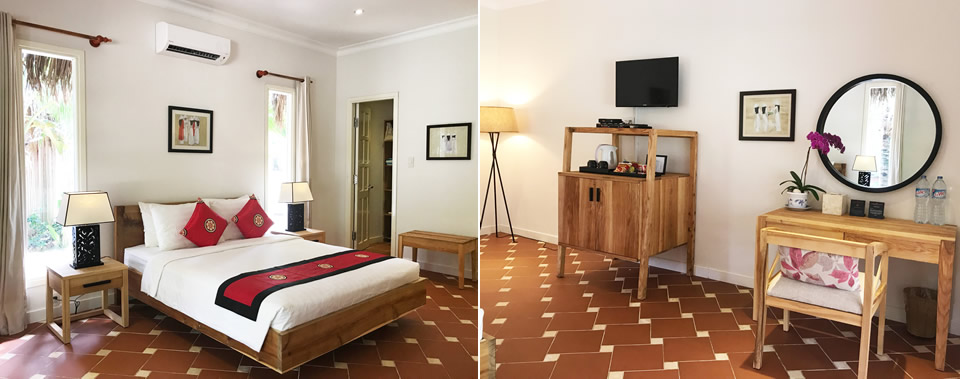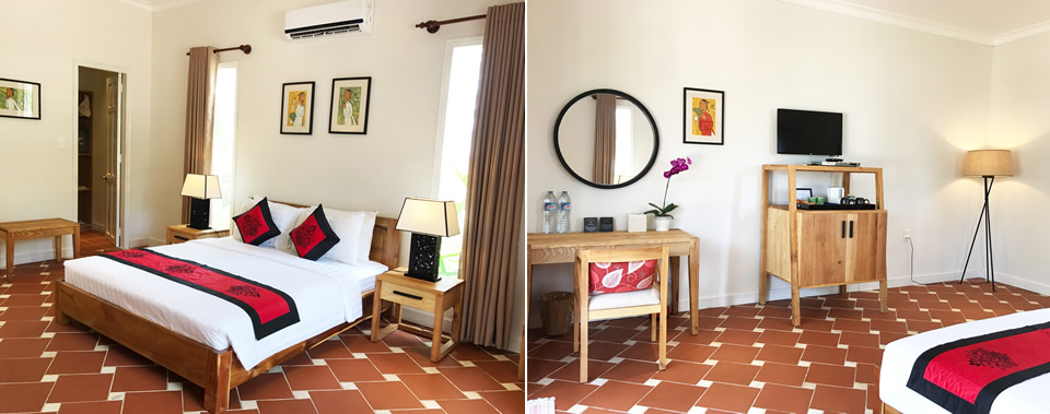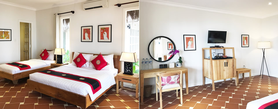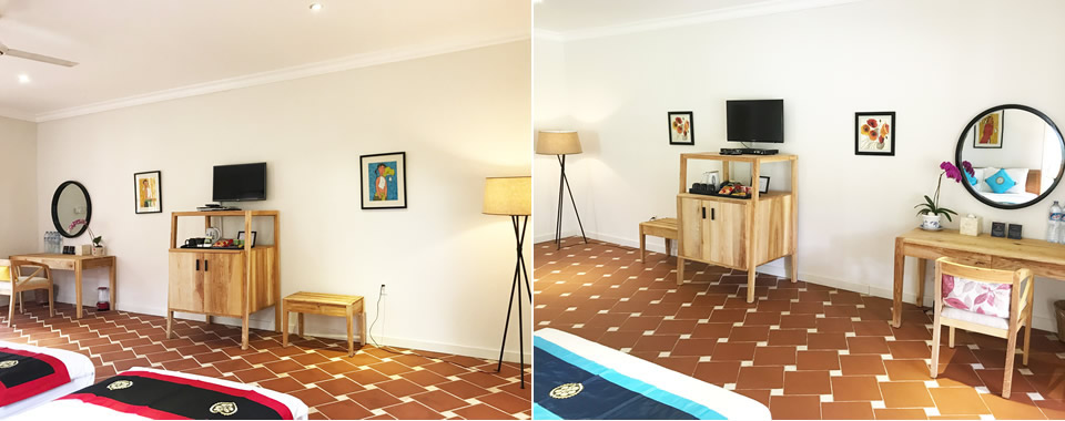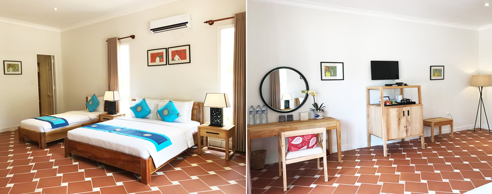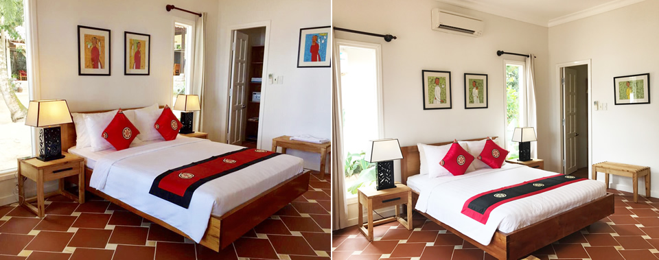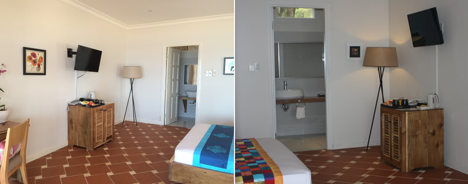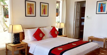 Our spacious, air-conditioned rooms are designed to maximize the views of the beach and the surrounding landscapes, located a few steps to the water and surrounded by a tropical garden. All our rooms are elegantly furnished with local custom made furniture. Each room has a private balcony with outdoor terrace table and chairs, private bathroom with shower, air conditioning and celing fan, a writing desk, along with a walk-in wardrobe, complimentary tea and coffee making facilities and 2 large bottles of mineral drinking water provided daily.