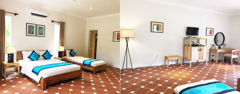 Our Garden View Family rooms are large and comfortable ideal for a family or a group of friends wanting to stay together. It is set amongst our garden of coconut trees and shrubs and is about 20 metres to the beach.